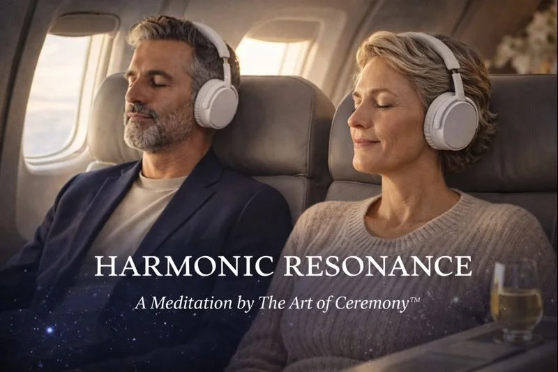 The complete Harmonic Resonance™ meditation is available here — a sanctuary of sound and ceremony designed especially for the inflight space, inviting travelers to step into stillness and presence at 30,000 feet.